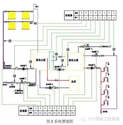 太阳能集热器+空气源热泵具有潜热充分利用、集热水箱+恒温水箱合理设计实现24h全天候热水、即开即热、恒温舒适的充分优势。将太阳能储热供热系统与空气源热泵连接,使各种能源得到充分利用,该系统以“节能、高效、稳定、可靠”为技术特点。(系统原理,详见图2)。