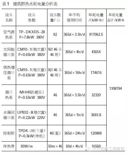 本项目合计使用热保温水箱1个,恒温供热水箱1个;空气源热泵机组辅助加热2 台,输入功率7.8kW/台(名义制热量28kW/ 台);太阳能集热循环泵2 台(1 用1 备);热泵循环泵1台;水箱间循环泵1 台;供热增压循环泵2 台(1 用1 备);全自动控制系统1 套;其他配套设备、设施、管道、管材若干,年度耗电总量如表1所示。